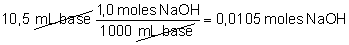 de NaOH reacciona con 1 mol de ácido acético, tendremos 0,0105 moles de